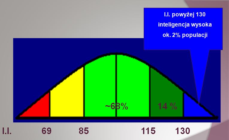 Gdybyśmy uporządkowali te kawałki, to zobaczymy, że ich ilość jest niejednakowa: najwięcej jest części jasnozielonych – to inteligencja przeciętna, którą wykazuje około 68% populacji (społeczeństwa):
